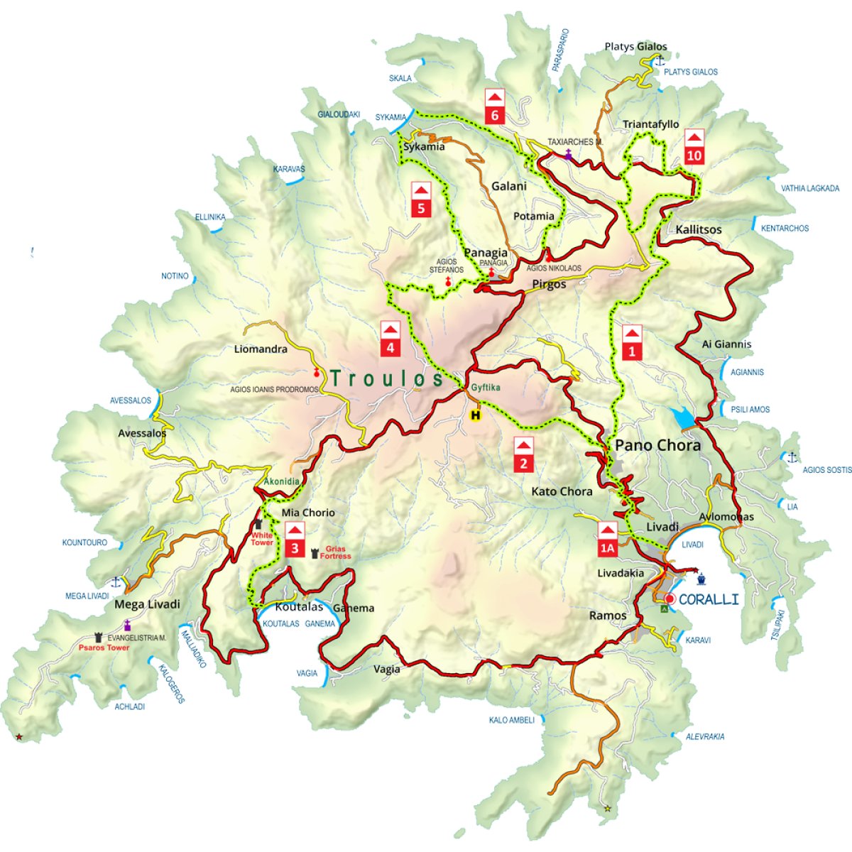 It starts and ends at the same point, the picturesque village of Kentarhos (Kallitsos). Its fascinating route takes us near windmills, dovecotes, orchards, springs, and the impressive church of the Virgin Mary (Panagia) of Skopianis. From Kentarhos it ascends to the southwest toward the area of Xero Chorio (between two hills with antennas), and then descends to the little church of the Prophet Elias (Profitis Ilias) , intersects the roadway to the north, reaches Triantafyllos, and again ascends to the south to the church of the Virgin Mary of Skopianis, concluding where it started in Kentarhos.